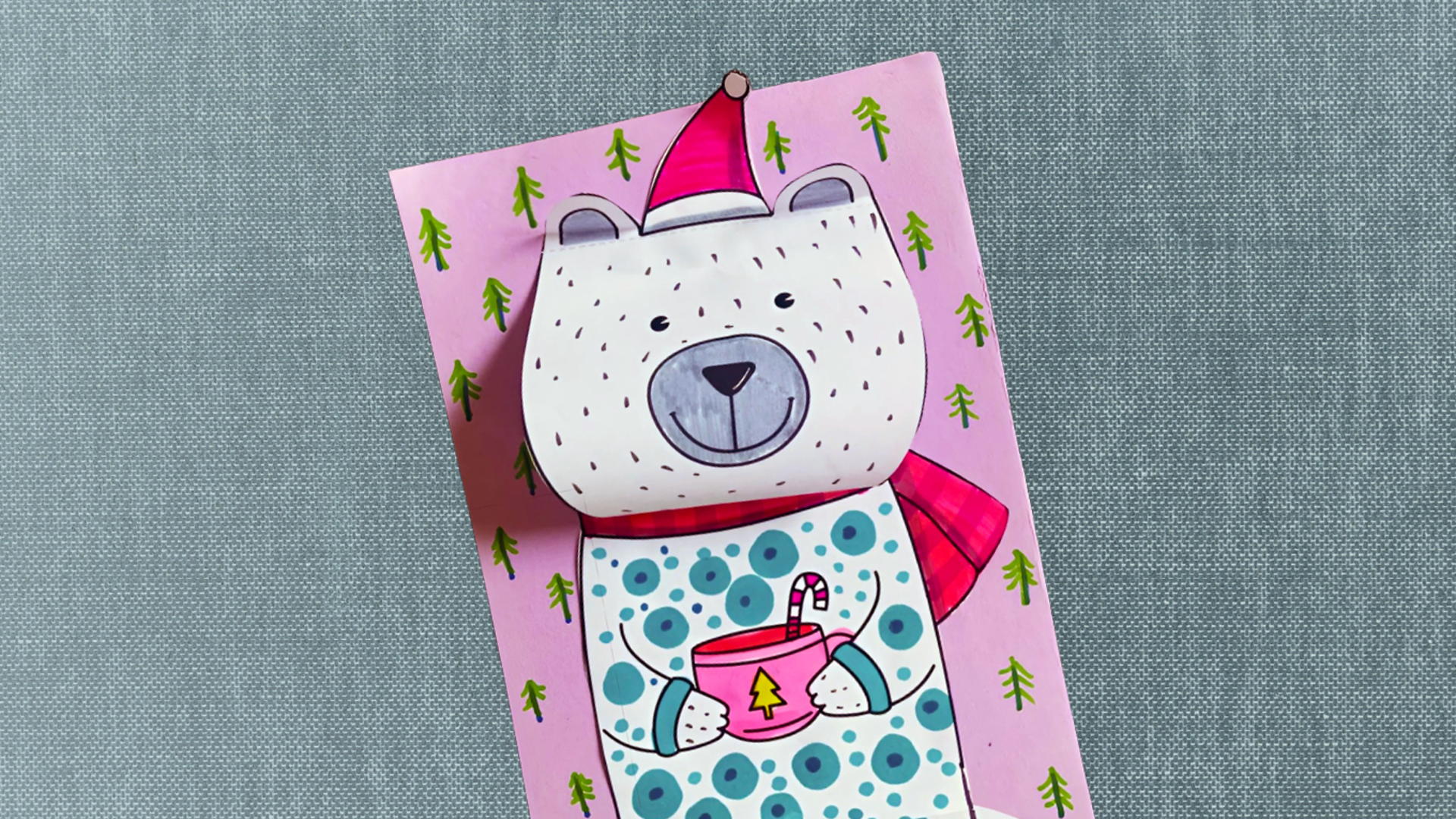 На мастер-классе, используя цветную бумагу, картон, ножницы, фломастеры и клей, сделаем очень милую открытку с белым мишкой!